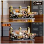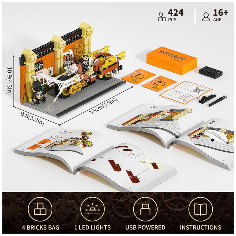 A construção integra um ponto de iluminação LED no farol dianteiro, simulando o farol aceso e enfatizando cenas noturnas ou de perseguição. A composição inclui engrenagens decorativas móveis, tubulações aparentes e peças temáticas que reforçam o estilo steampunk.??