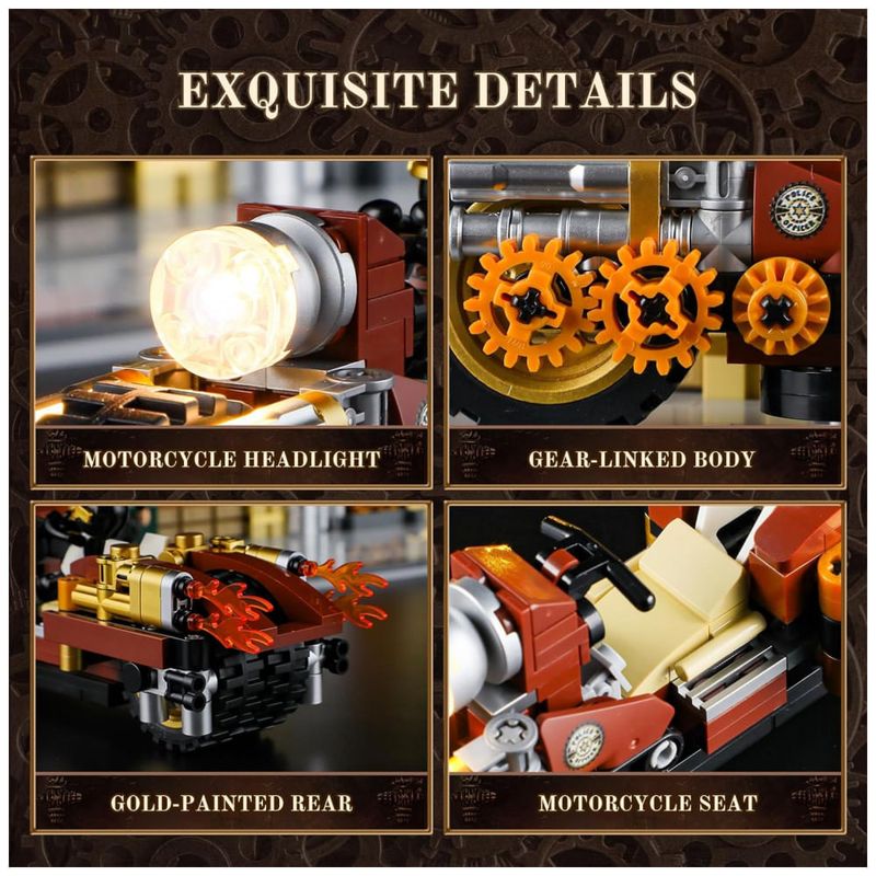 Conjunto de blocos de montar em plástico que representa uma motocicleta steampunk com visual retroindustrial, combinando engrenagens aparentes, tubos metálicos e elementos que sugerem acionamento a vapor. A paleta usa tons de latão, preto e marrom, reforçando a estética vitoriana reinterpretada em linguagem de ficção científica.?