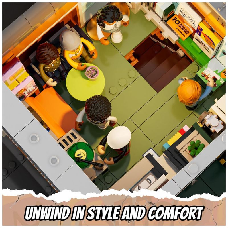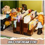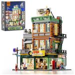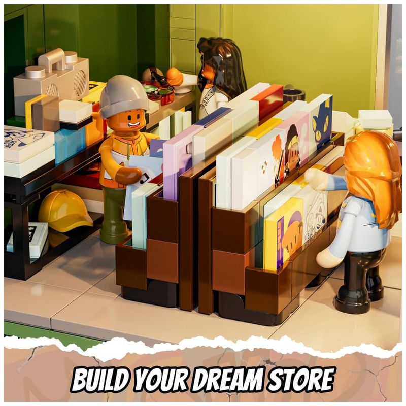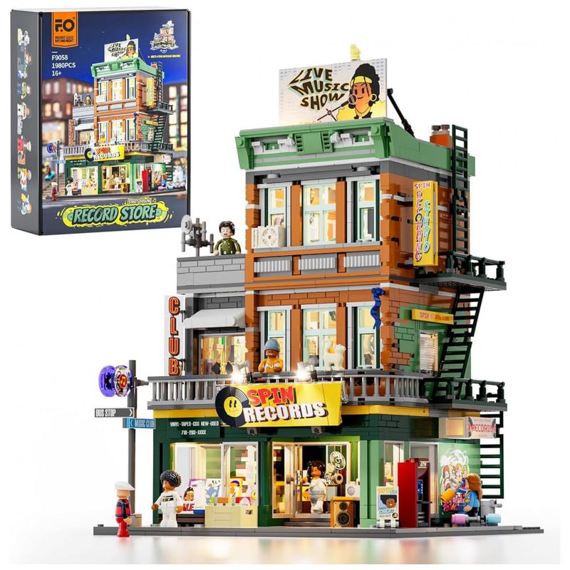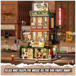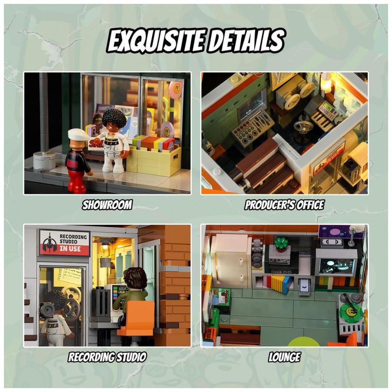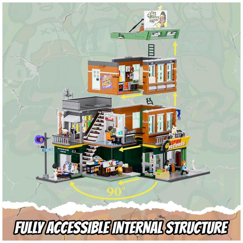 Conjunto de blocos de montar em plástico que representa uma loja de discos em ambiente urbano, com três níveis funcionais: área de venda de discos no térreo, estúdio de gravação no segundo piso e lounge para encontros e atividades musicais no terceiro andar. A fachada utiliza elementos de cultura de rua, com letreiros, vitrines e painéis decorativos associados a música e hip-hop.??
