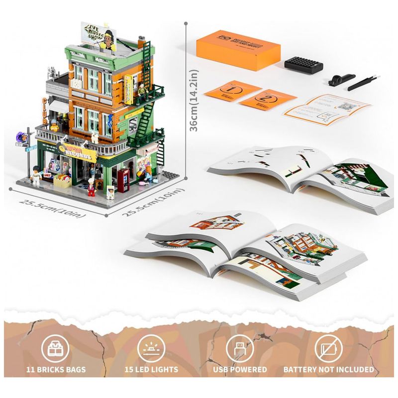O sistema de iluminação dispõe de múltiplos pontos de LED distribuídos em refletores, caixas de luz e tiras internas, projetados para destacar a construção em condições de baixa luminosidade. O modelo integra a linha de prédios modulares de cidade, podendo ser combinado com outros cenários urbanos para compor uma rua temática de entretenimento.??