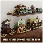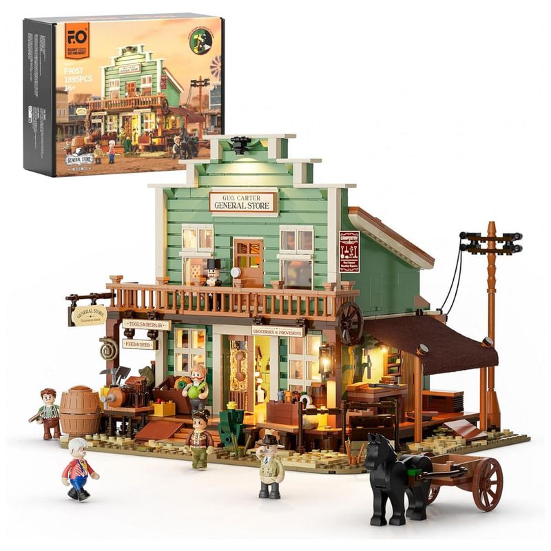 Conjunto de blocos de montar em plástico que reproduz uma loja geral típica de cidade do Velho Oeste, com fachada detalhada, plataforma de madeira frontal e pavimento superior tipo sótão. A construção retoma elementos arquitetônicos do século XIX, como estrutura em madeira, marquise frontal e dois níveis voltados para a rua principal.