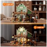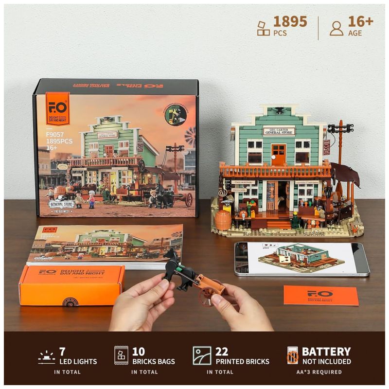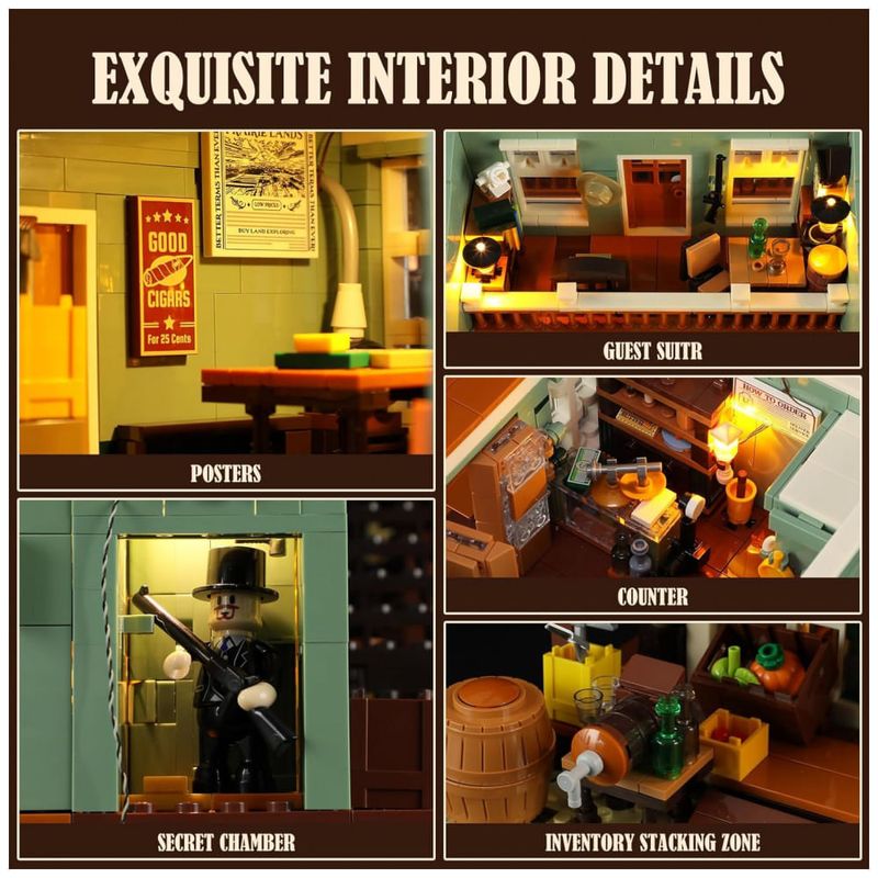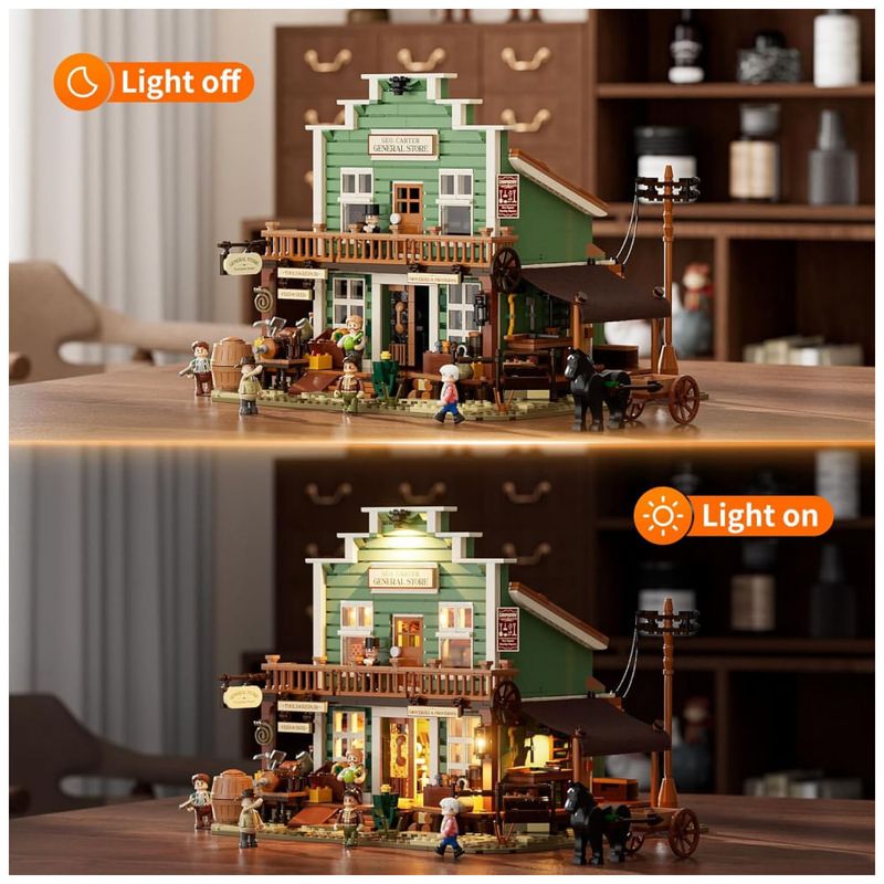 O sistema de iluminação por LED distribui pontos de luz em áreas internas e externas, destacando a placa frontal, a varanda e zonas internas da loja. O produto é voltado para adultos, com grande quantidade de peças, alto nível de detalhamento e montagem indicada para exposição em coleções temáticas de Velho Oeste.