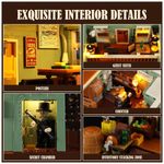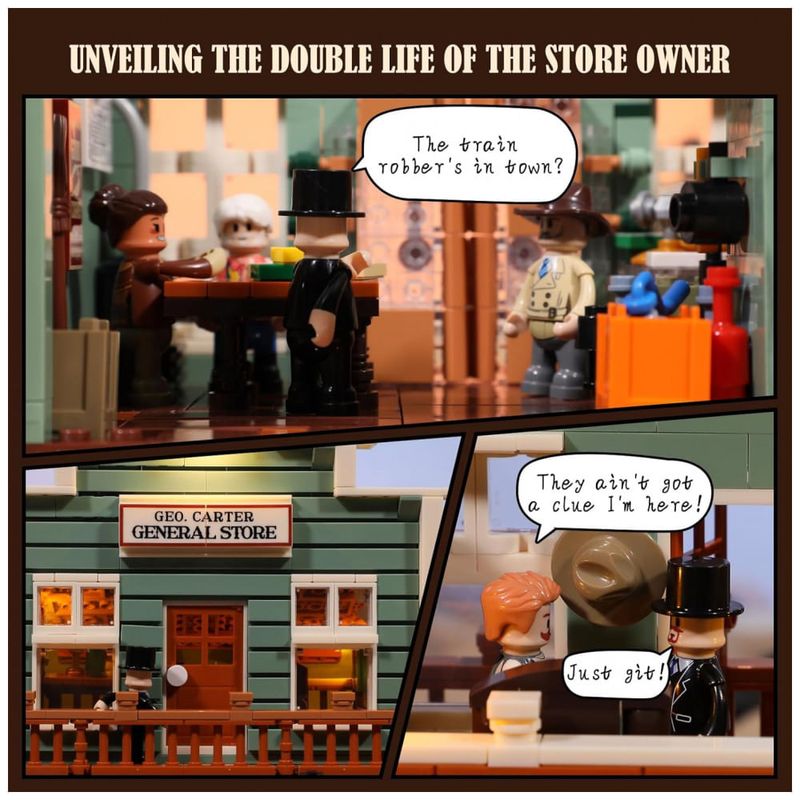 A estrutura foi projetada para exposição, com parede removível e cobertura destacável que facilitam o acesso visual aos ambientes internos e a reorganização de móveis e personagens. O conjunto acompanha diferentes figuras, como comerciante, auxiliar, trabalhador ferroviário, agricultor, garimpeiro e detetive, ampliando as possibilidades de narrativa no cenário western.