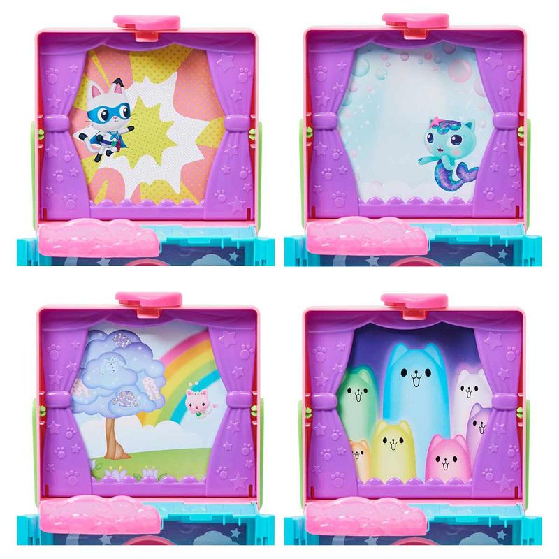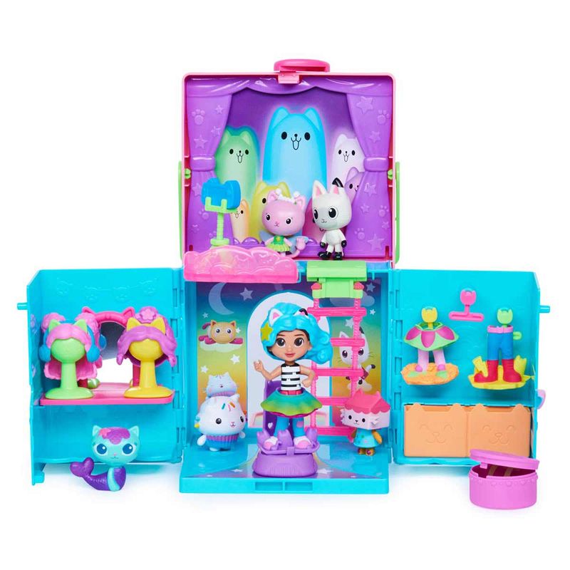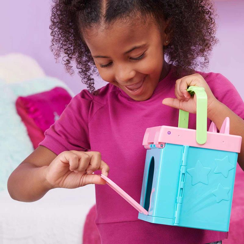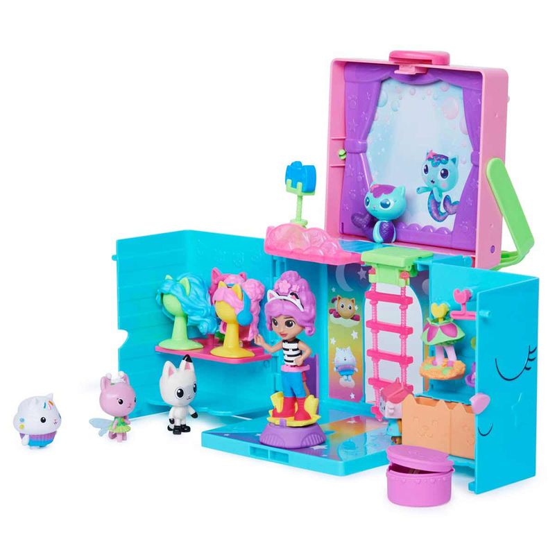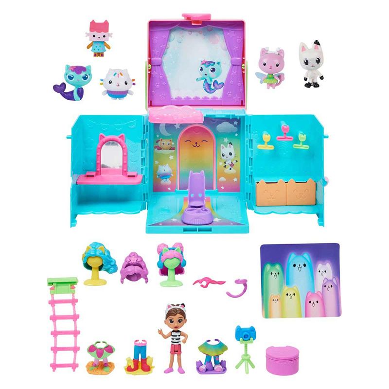 Conheça o Closet Arco-Íris da Gabby's Dollhouse. Ele possui 4 áreas para brincar: Dirija-se à penteadeira e ao espelho, que apresenta três perucas estilosas e dois suportes para perucas, para que você possa fazer o cabelo e a maquiagem de Gabby! Depois, dirija-se ao closet, que possui três cabides de parede e gavetas para armazenamento, além de duas roupas diferentes para Gabby escolher! Depois de escolher uma roupa, suba no pódio giratório e empurre a gabby para frente e para trás na passarela, para girá-la! Então, não se esqueça de abrir sua Dollhouse Delivery, para revelar seu acessório surpresa, assim como Gabby faz no show! Quando ela estiver pronta, use a escada para subir até o estúdio fotográfico, onde você pode escolher um dos 4 fundos diferentes para sua sessão de fotos. Depois de colocar o tripé e a câmera na varanda, Gabby está pronta para fazer uma pose! Para uma última surpresa, digitalize o código QR dentro da Dollhouse Delivery (Caixa Surpresa) para desbloquear uma recompensa especial no aplicativo gratuito Gabby's Dollhouse (disponível para iOS e Android).