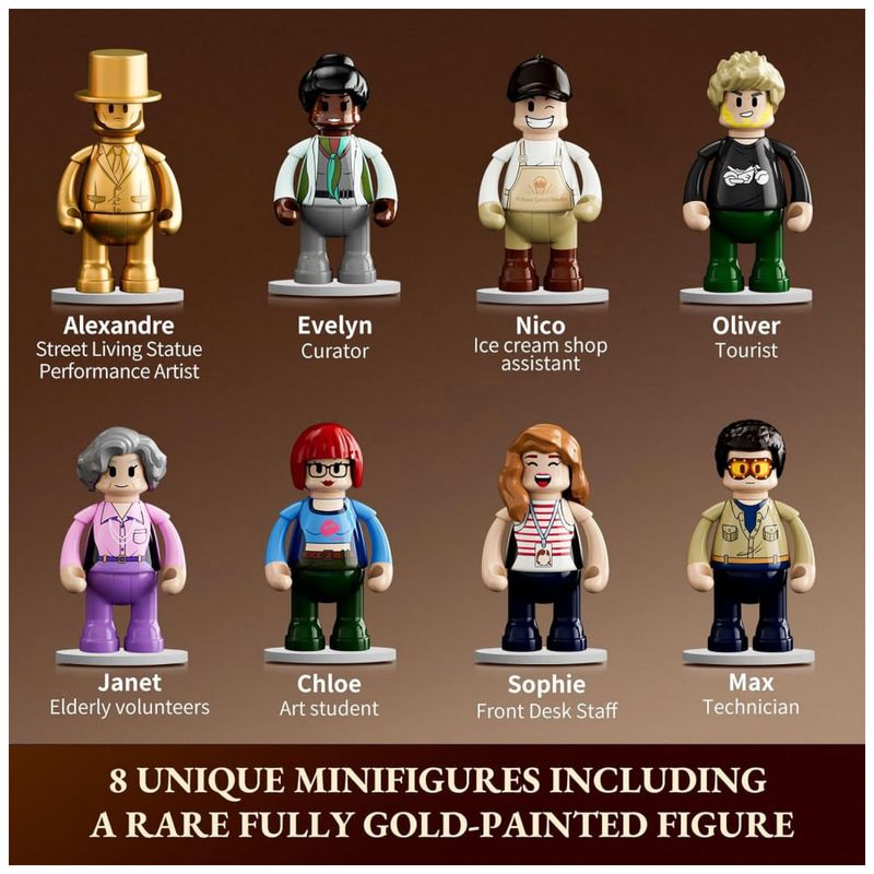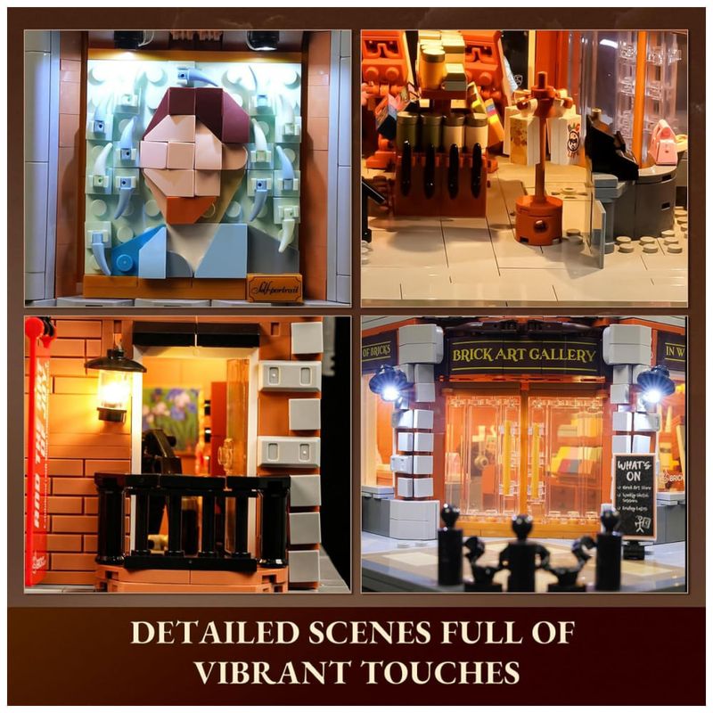 Os interiores organizam-se em três níveis: primeiro andar com loja de souvenirs, segundo com exposições temáticas Van Gogh e Mondrian, terceiro com estúdio de esculturas. O exterior reproduz arquitetura europeia com arcos de tijolo, sinalização de rua, bancas "antigas" e caminhão de sorvetes, incluindo 8 minifiguras diversas com uma dourada exclusiva.