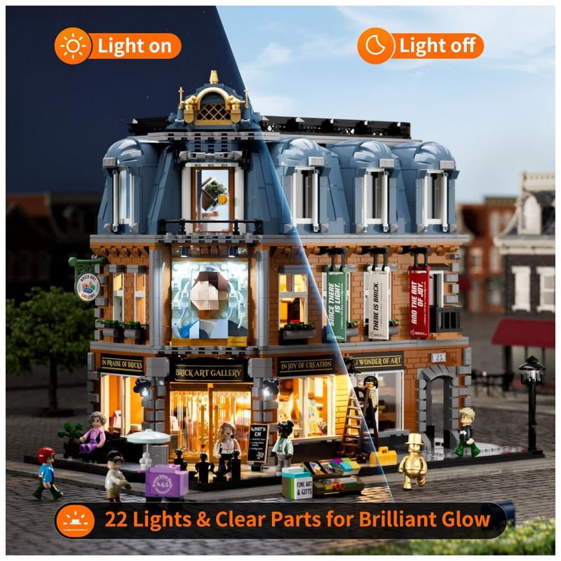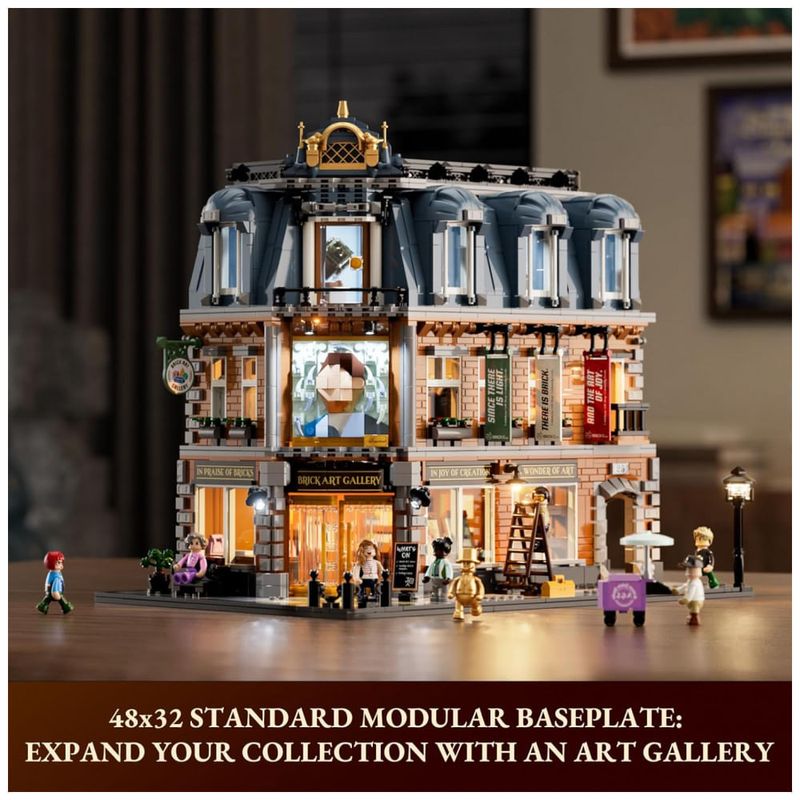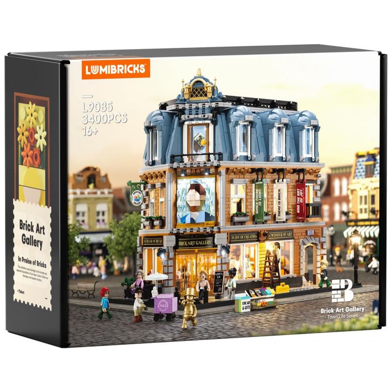 O kit Lumibricks Galeria Arte Brick reúne 3400 peças plásticas ABS inspiradas em galerias comunitárias europeias, combinando estética retrô-moderna com sistema de iluminação exclusivo de 22 LEDs e 7 faixas luminosas, incluindo spotlights profissionais para ambientação de galeria (pilhas não inclusas). A interface Type-C permite conexão em cadeia para múltiplos edifícios, criando cenários noturnos urbanos integrados.