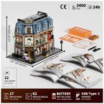 A estrutura de esquina apresenta design de desmontagem rápida em três camadas, acesso total pela traseira aberta e piso do segundo andar retrátil, com base modular 48x32 cm para integração com outros edifícios de rua. Inclui mais de 60 blocos impressos (sem adesivos), 11 peças douradas para telhado e extensas partes transparentes no térreo para amplificação de efeitos luminosos.