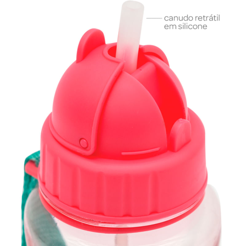 - Possui proteção de uma tampa flip-top, com canudo em silicone e retrátil; vem com pulseira para ajudar a criança carregar sua garrafinha