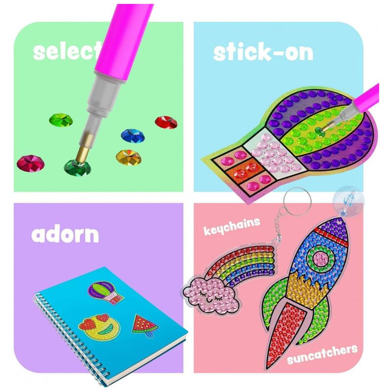 Libere e desperte sua criatividade designs deliciosos e coloridos estão esperando por você para animar com mini diamantes cintilantes. Faça apanhadores de sol para iluminar as janelas de qualquer sala, chaveiros para pendurar em qualquer lugar e adesivos de holograma para colocar onde quiser.