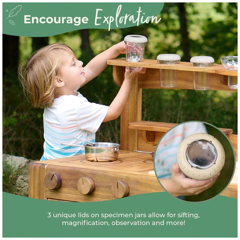 O conjunto acompanha dois funis plásticos em formatos diferentes, um copo dosador/pá para manipular lama e areia e três potes tipo “specimen jar” com tampas variadas, que podem ser usados para observação e experimentação com pequenos elementos encontrados na natureza, como folhas, pedras ou sementes. Esses acessórios favorecem atividades de exploração, experimentação e jogos de faz de conta com foco em descoberta e observação do ambiente externo.?