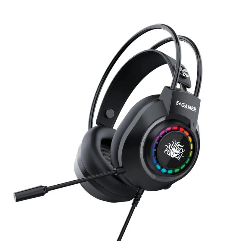 O Headset Gamer X5-2000 da marca 5+ Gamer oferece uma experiência de áudio imersiva e confortável para longas sessões de jogo, utilizando a tecnologia de som surround 7.1 virtual para posicionamento sonoro preciso. O design robusto com iluminação RGB e a conexão USB plug-and-play garantem facilidade de uso e um visual moderno, sem a necessidade de drivers complexos. Com microfone flexível e arco ajustável, o headset é construído para durabilidade e comunicação eficiente em partidas online.
