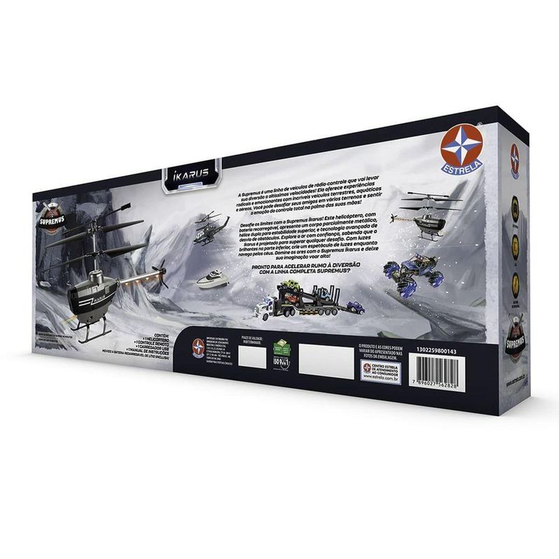 O Supremus Íkarus é um helicóptero de controle remoto movido a bateria recarregávelSua carroceria é de plástico com eixo de metal, e possui luzes chamativas em sua caudaAlém disso, ele possui uma tecnologia avançada de estabilidade Gyro, que proporciona voos suaves e controlados, além da capacidade de evitar obstáculos com muita maestriaCom manobras das mais simples as mais avançadas o Ikarus é diversão garantidaSua bateria leva 40 minutos de carregamento e tem tempo de uso de 8 minutos, o controle requer 2 pilhas AAPeças: