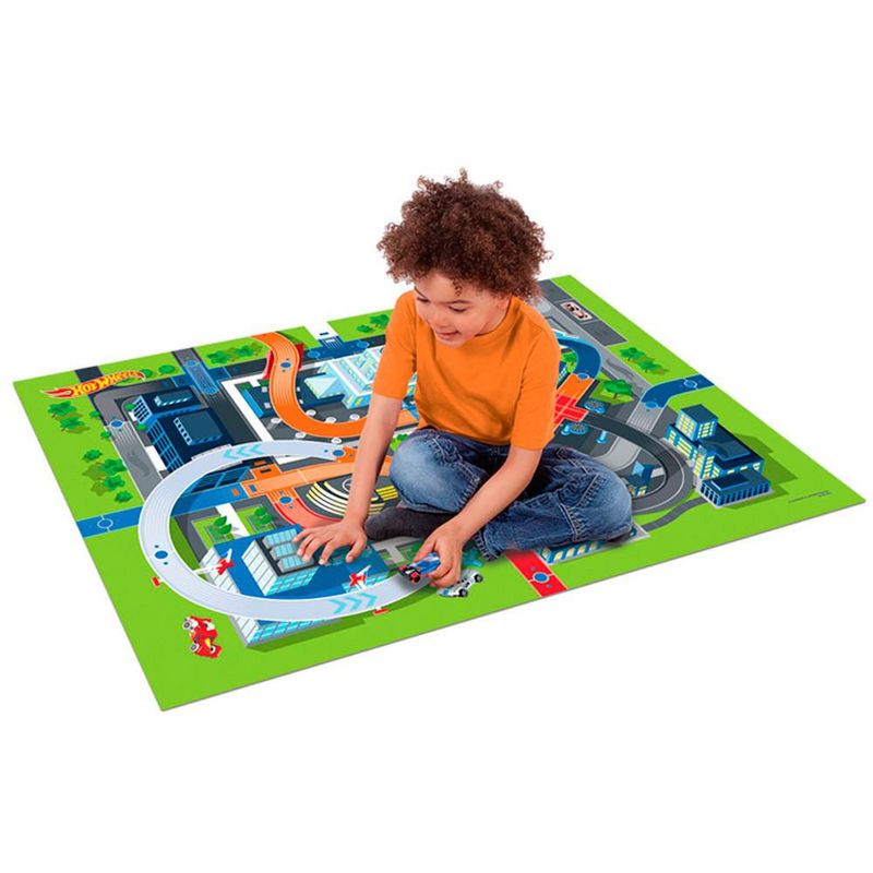 • Tapete com pista e carrinho Hot Wheels - O tapete é estampado com a pista personalizada da série para a criança brincar com o carrinho pelas áreas desenhadas. • Escolha o seu preferido ou colecione! • Tamanho do tapete: 90 x 120 cm • Contém: tapete com pista Hot Wheels + 1 carrinho modelo sortido • Material: PET, METAL, PAPEL E EVA | tapete em espuma EVA • INMETRO: 010473/2022 • Indicação: +3 anos