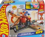 Você pode pressionar o compartimento de moedas para baixo para fazer as balas de goma se moverem e lançar o carro pela rampa de saída. Na base, há um portão móvel para brincadeiras interativas e estacionamento para outros carros. O conjunto pode ser conectado a outros conjuntos e pistas Hot Wheels usando o sistema Pista Speed Snap.