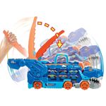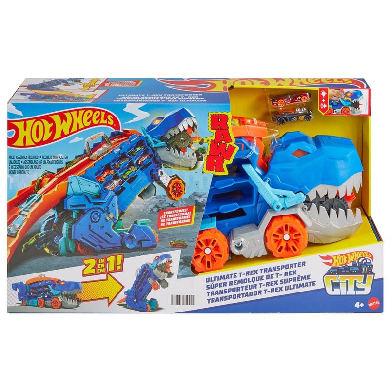 Transforme o Hot Wheels City Ultimate Hauler de um transportador de mais de 20 carros de brinquedo em um T-Rex rosnando e pisoteando!
