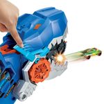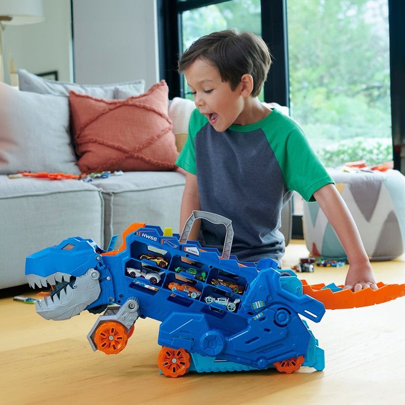 As crianças podem lançar seus carros pela boca do T-Rex e parece que ele está cuspindo.