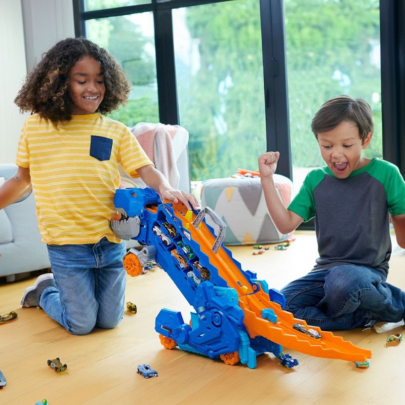 A parte de trás do T-Rex é uma pista de corrida de duas pistas. Corra com os carros Hot Wheels incluídos; o vencedor continua, enquanto o segundo colocado fica 'cagado' no dinossauro.