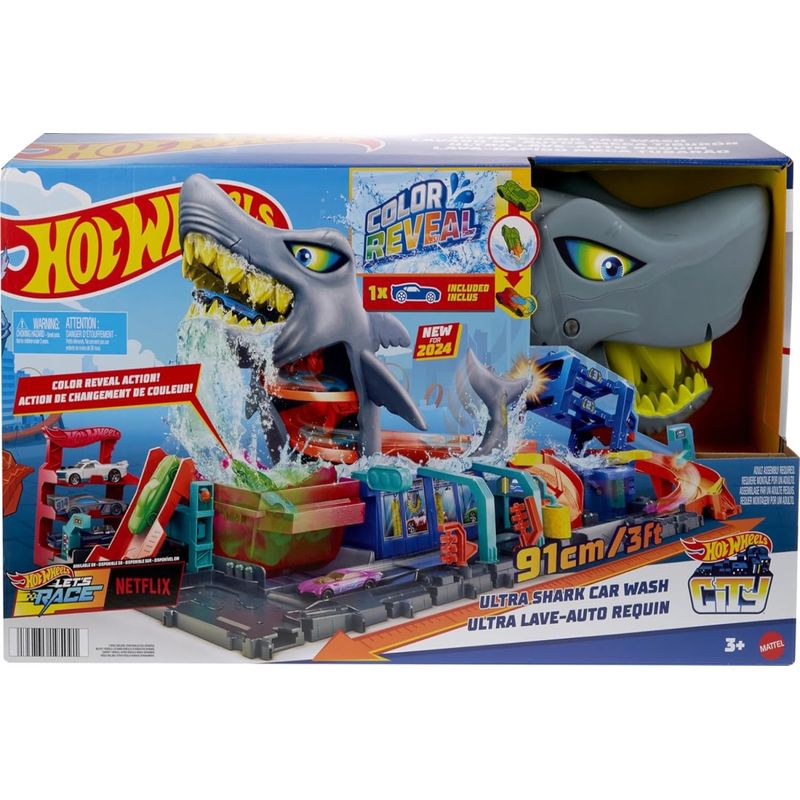 Hot Wheels City, Pista de Brinquedo Lava-Rápido Mega Tubarão com 1 Carrinho Color Reveal