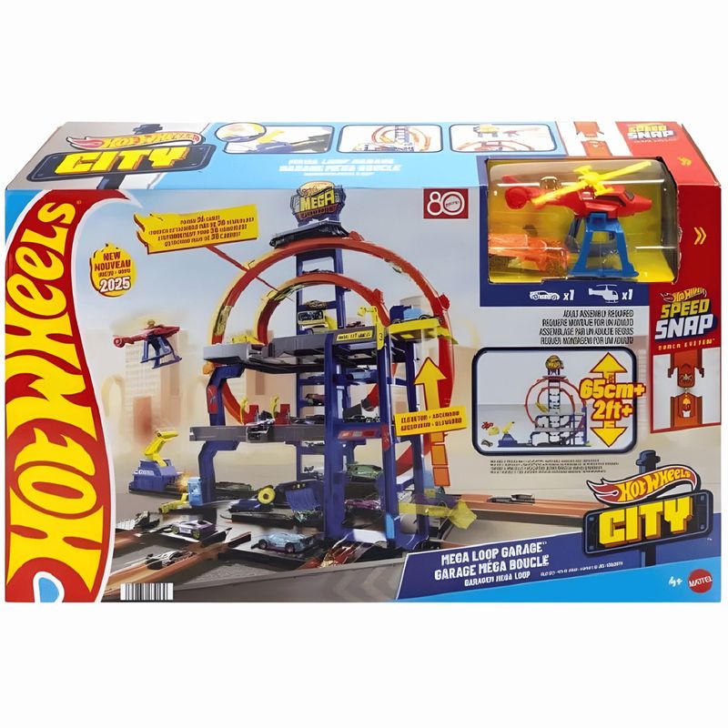 O conjunto de brinquedos Hot Wheels City Mega Garagem tem três níveis de brincadeiras centradas no carro para envolver os jovens pilotos em narrativas imaginativas e acrobacias épicas. No piso da base desse conjunto de vários níveis, as crianças podem dirigir seu carro em um lava-rápido que apresenta um rolo de espuma móvel e uma cortina de lavagem. Em seguida, você pode carregar o carro no lançador e enviá-lo para o loop duplo, onde os desviadores ajudam a guiá-lo até o andar desejado. Você pode usar um elevador movido por crianças ou usar o helicóptero de transporte de carros para transportar os veículos para qualquer nível para estacionamento. A brincadeira pode ser ampliada usando os conectores Pista Speed Snap. Um carro de brinquedo die-cast da Hot Wheels e um helicóptero de brinquedo estão incluídos. Veículos e pistas adicionais são vendidos separadamente.