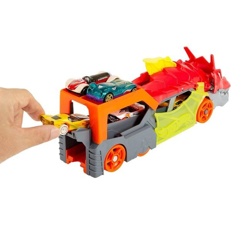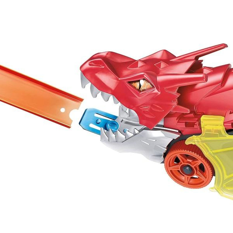 Dragões regulares cospem fogo, mas o Hot Wheels City Dragon cospe veículos Hot Wheels de suas bocas para diversões e emoções incríveis.