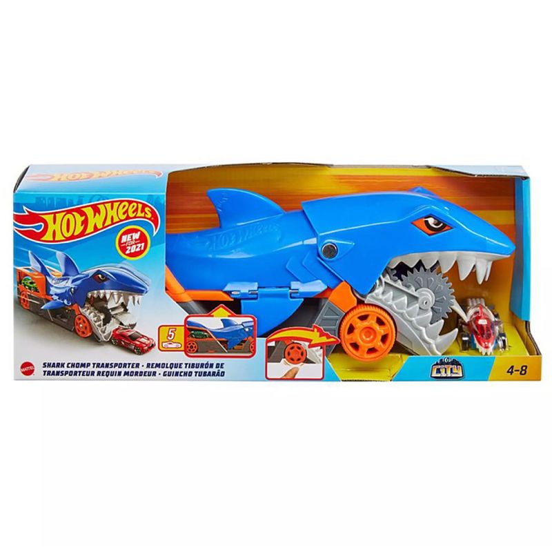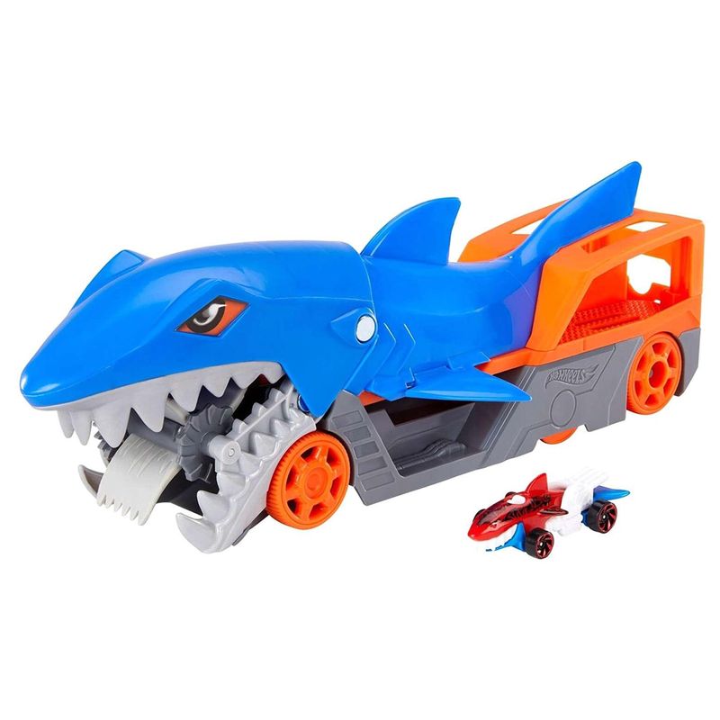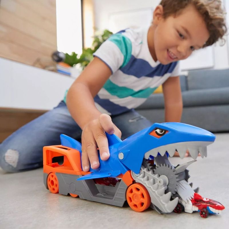 O conjunto de Guincho Tubarão Hot Wheels recria o icônico Shark Bite Hot Wheels como um caminhão totalmente novo e incrível. Basta empurrar o caminhão para ativar um mecanismo especial de mordida que faz o tubarão agarrar os carros direto com suas poderosas mandíbulas para engoli-los e guardá-los na barriga. E na hora de descarregar? Há uma rampa de saída na parte de trás para facilitar o acesso. O carro Guincho Tubarão Wheels vem com um (1) carro Hot Wheels em escala de 1:64 e comporta até mais quatro (vendidos separadamente)! Crianças a partir de 4 anos vão adorar fazer o tubarão dar mordidas e engolir os carros!