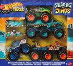 -Você pode recriar os momentos favoritos da série do YouTube Kids Hot Wheels Monster Trucks Tubarões vs. Dinossauros com um pacote múltiplo que inclui seis veículos de tamanhos diferentes!