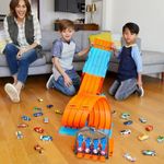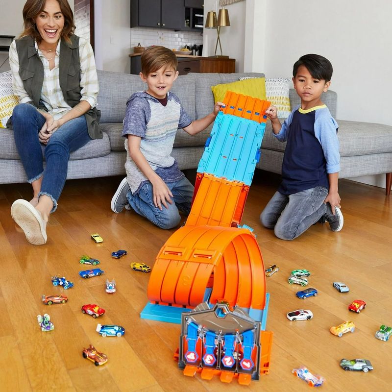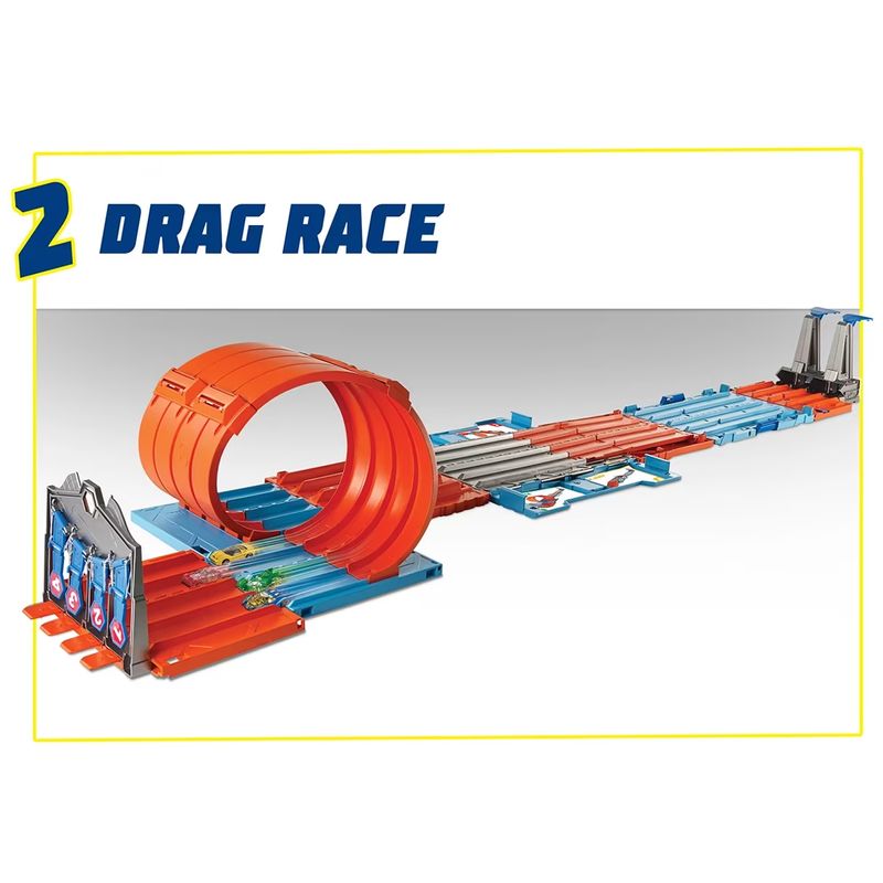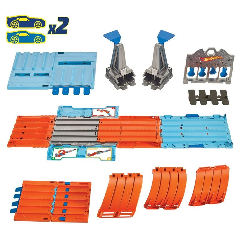 A caixa de corrida hot wheels é o melhor conjunto que reúne construção de pistas e manobras em um só lugar! combina várias formas de brincar com 3 pistas emocionantes e exclusivas. as crianças podem correr, dar voltas e desafiar os amigos quando transformam essa caixa incrível em 3 diferentes desafios, incluindo a queda de gravidade, mega salto e corrida de arrancada! incite a imaginação das crianças com a pista de saltos, mais de 2,43 metros de pista e diversos desafios que elas podem experimentar usando o portão de início, o circuito de 2 pistas, o portão de chegada e 2 lançadores duplos. cada caixa inclui um manual do construtor. alguns pilotos mais jovens podem precisar da ajuda dos pais para montar os desafios. todos os acessórios incluídos podem ser usados em outros conjuntos com instruções de montagem e etiquetas para armazenamento, instalação e detalhamento. dobre a caixa para cima e coloque todas as peças lá dentro para facilitar o transporte e armazenamento. inclui 2 carros hot wheels. para crianças de 6 a 10 anos