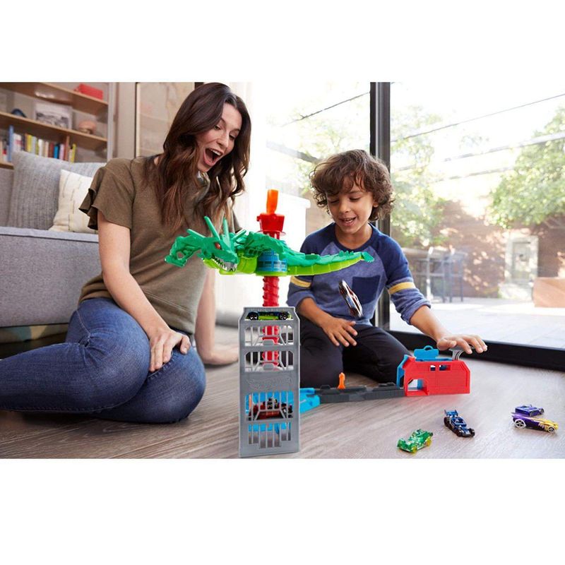 Salve a Cidade de Hot Wheel neste conjunto motorizado com um fantástico inimigo Dragão Robô Air Attack.