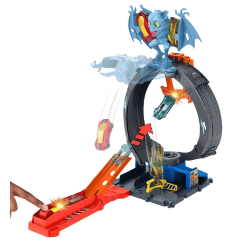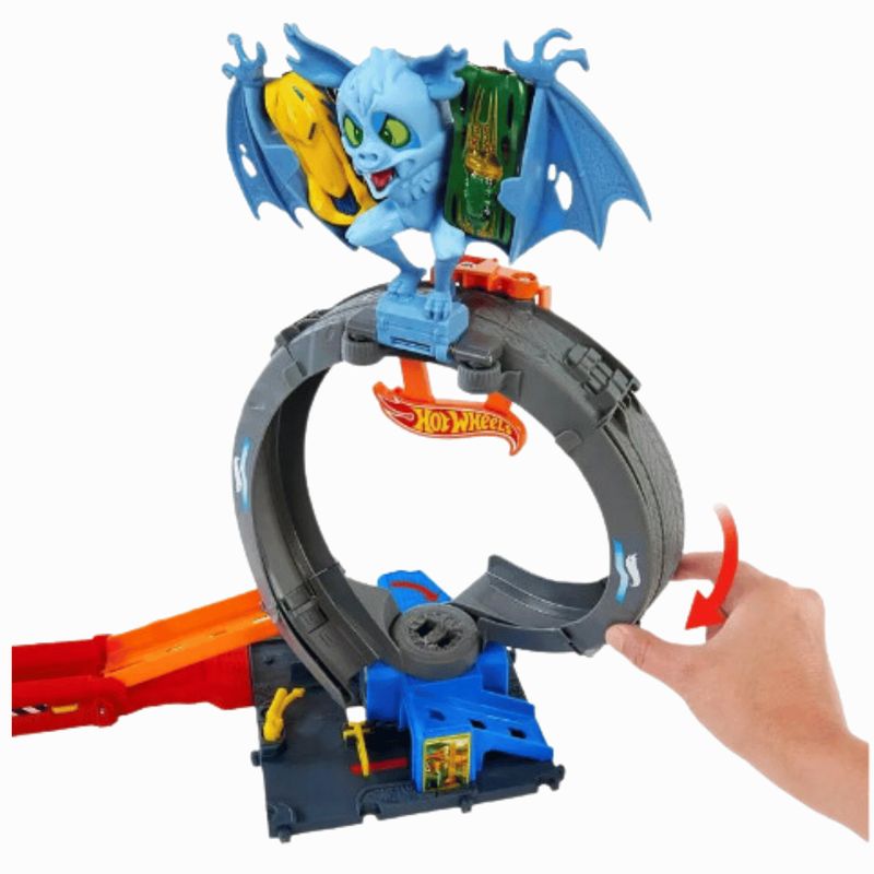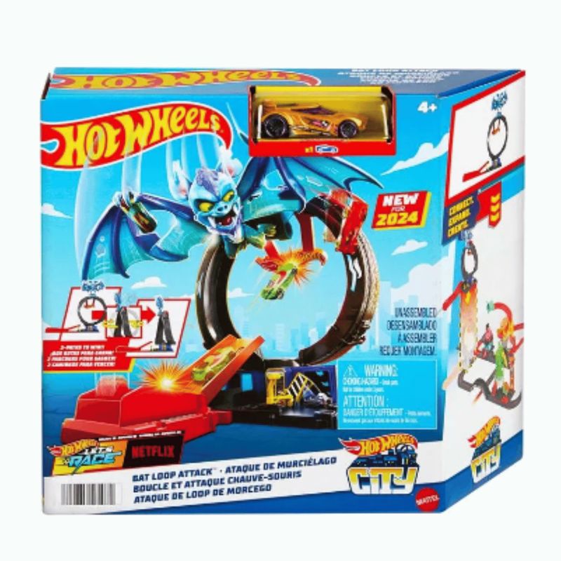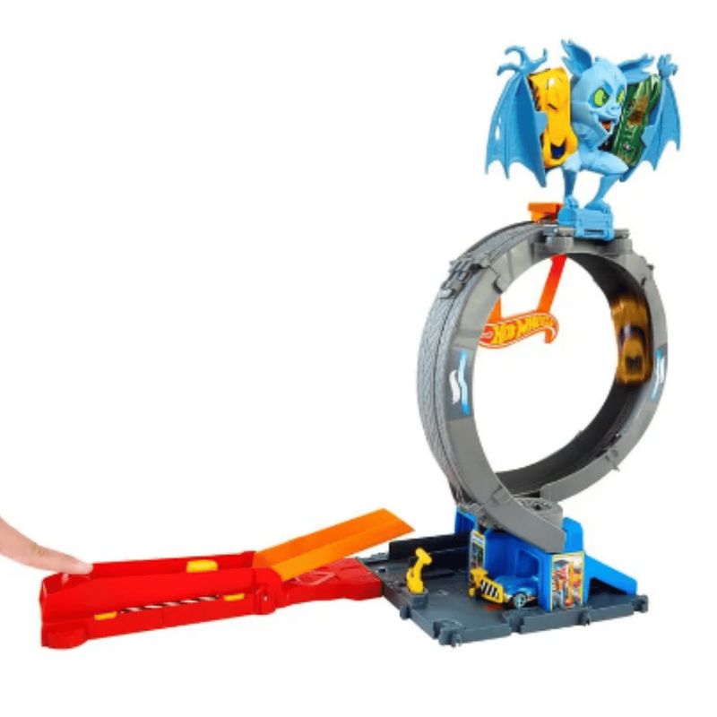 Um morcego selvagem atacou a loja de pneus Hot Wheels City, assim como na série da Netflix "Let's Race", e cabe às crianças com grandes habilidades de acrobacias salvarem o dia. Lançar os carros em um loop pode derrubar o morcego, e a pista também permite ajustar o loop e o lançador para acertar diretamente a criatura. As crianças também podem se concentrar no jogo de pista e evitar o nêmesis correndo sob o loop e em outras aventuras. A pista pode se conectar a outras pistas e conjuntos Hot Wheels para uma brincadeira sem fim. Um carro Hot Wheels em escala 1:64 está incluído.