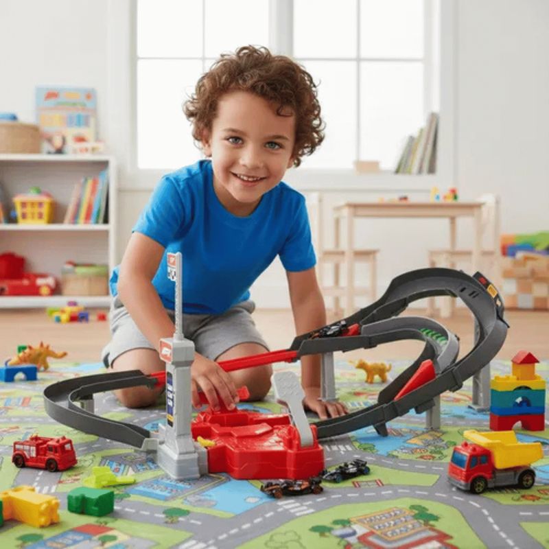 No modo de corrida, carregue os veículos no lançador de giros e acione a alavanca para enviá-los em alta velocidade para a pista.