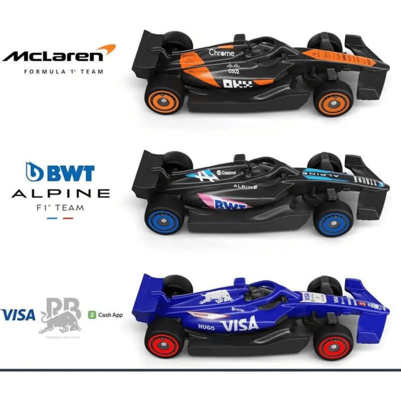 Ele inclui três carros de Fórmula 1 fundidos em escala 1:64 com decorações combinando com as equipes favoritas dos fãs, como McLaren Formula 1 Team, BWT Alpine F1 Team e Visa Cash App RB Formula One Team, e duas maneiras de jogar.