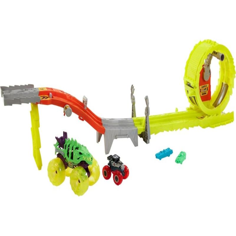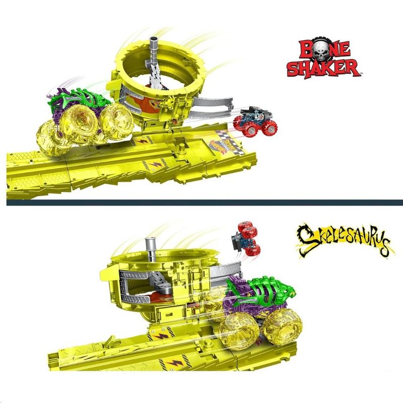 Aviso: Imagens meramente ilustrativas!! Um Skelesaurus de grandes dimensões e o Bone Shaker em escala 1:64 se enfrentam em uma corrida para evitar a destruição! Você pode soltar os dois veículos com o interruptor de energia e ver se o Bone Shaker consegue vencer o inimigo maligno enquanto eles descem uma colina em alta velocidade em direção a um enorme loop. A distribuição aleatória seleciona um de dois resultados: O Bone Shaker consegue atravessar o loop e escapar em segurança, enquanto o Skelesaurus fica na poeira, ou o Skelesaurus pega sua presa, prendendo o Bone Shaker no loop, derrubando-o. O conjunto inclui dois carros esmagados para maior destruição. Contém 1 Pista, 1 Skelesaurus em escala 1:24, 1 Bone Shaker em escala 1:64 e 2 carros esmagados. Idade: 4+ anos Marca: Mattel Materiais: Plástico REFF: HXT05 Medidas Aproximadas da Pista Montada: 116cm Comprimento Pista: Requer Montagem