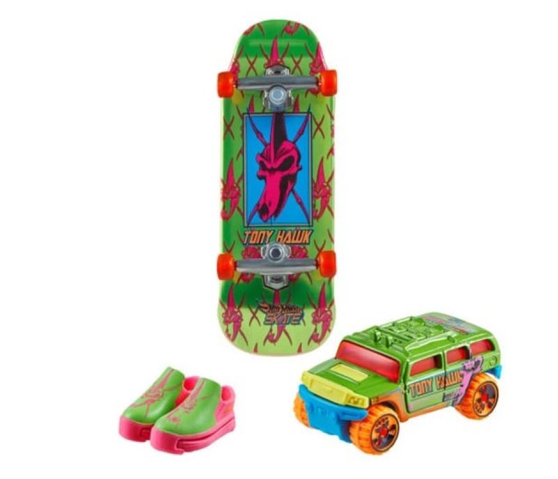 Desfrute da experiência Skate™ Hot Wheels com este conjunto fofo que inclui um skate de dedo e tênis de skate, além de um carro Hot Wheels®. A coleção foi concebida em colaboração com a lenda do skate Tony Hawk, e cada conjunto tem detalhes que combinam com as imagens na prancha metalizada e um carro Hot Wheels® exclusivo. Os sapatos removíveis ajudam as crianças a sentir a prancha enquanto experimentam ollies, saltos e um 360 sobre o carro Hot Wheels® incluído. Os grommets serão desafiados como profissionais em pouco tempo, pois estarão dominando suas acrobacias cheias de estilo como Tony Hawk! As crianças e os colecionadores vão querer cada conjunto de pranchas, sapatos e carros com seu design premium. Vendidos separadamente, sujeitos a disponibilidade.
