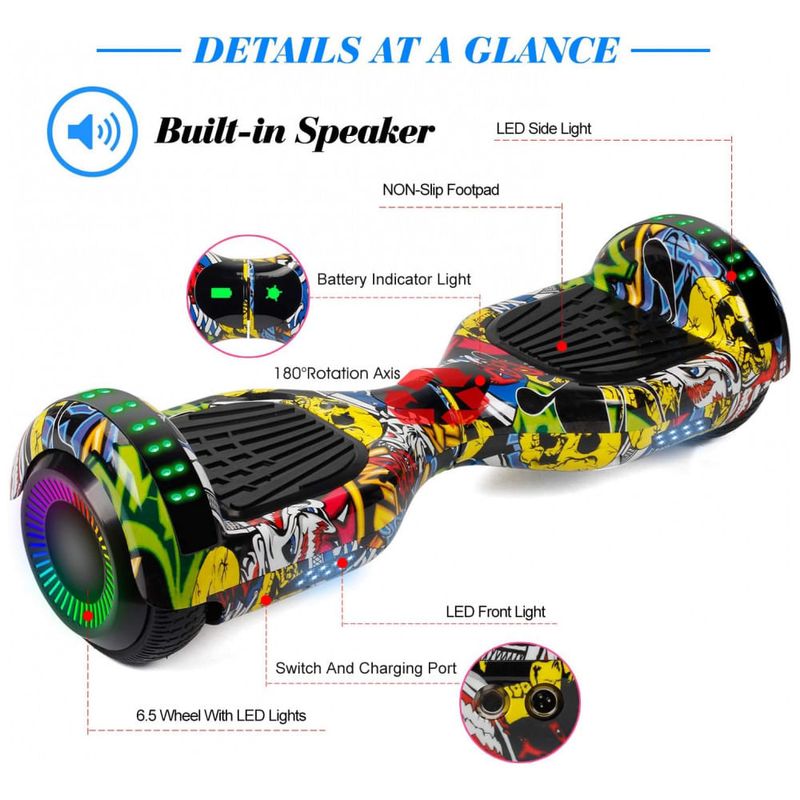 O Hoverboard FLYING-ANT 6.5" na elegante cor Vermelho B-Graffiti é a perfeita união entre tecnologia, estilo e segurança. Desenvolvido para proporcionar uma experiência de mobilidade divertida e sofisticada, este hoverboard combina motores duplos potentes, iluminação LED futurística e alto-falante integrado, permitindo que você se desloque ao som de suas músicas favoritas. Com certificação UL2272, cada detalhe foi pensado para garantir total segurança, desde o design resistente e portátil até os sistemas de desligamento de emergência. Ideal para crianças e adultos, ele oferece equilíbrio preciso e diversão sem limites, suportando usuários de 20 a 90 kg e alcançando até 10 km de distância com autonomia de 30 a 60 minutos após um carregamento de 3 a 5 horas. O processo de conexão Bluetooth é simples e rápido: basta ativar o Bluetooth do celular, ligar o hoverboard, emparelhar e aproveitar a música. Compacto e estiloso, este modelo é também um presente perfeito, combinando arte, inovação e tecnologia de ponta em cada detalhe.