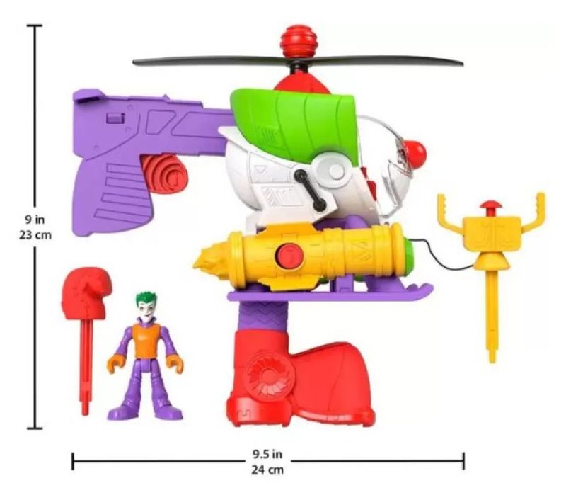 Conteúdo da Embalagem: 1Helicóptero, 1 Figura do Coringa, 1 Acessório Projétil Levante a hélice para transformar o helicóptero em um robô de 25,4 cm de altura , a figura do Coringa cabe dentro do cockpit