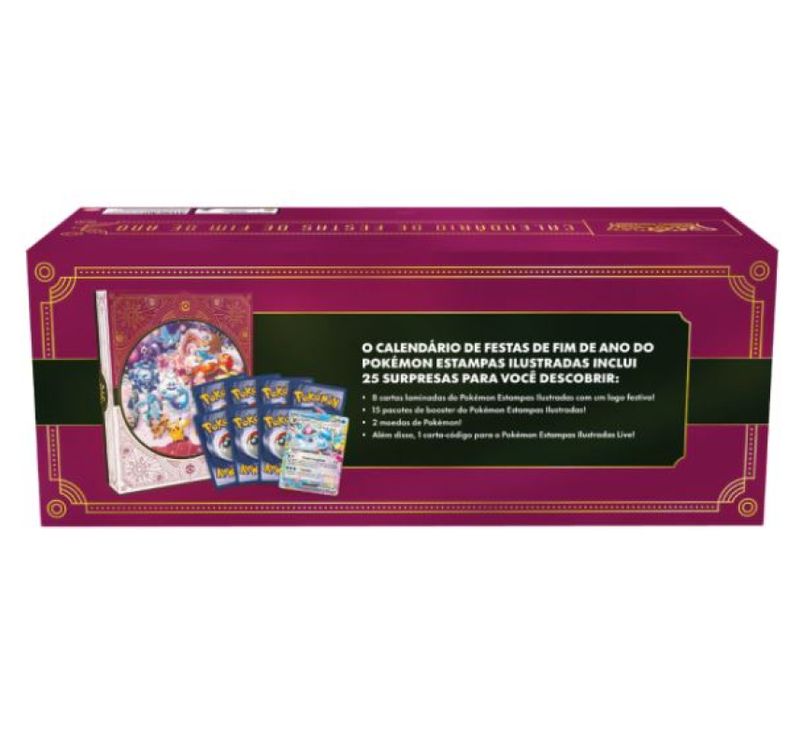 A ideia desse produto é criar um clima festivo de fim de ano, de forma antecipada. Esse item é um belo presente para qualquer Treinador Pokémon ou Colecionador Pokémon, contendo cartas com estampas exclusivas e itens exclusivos desse evento. Por se tratar de um calendário, ele tem vários números e cada dia, você destaca uma área do calendário e ganha a recompensa presente naquele espaço. Todo dia, fica sendo dia de presente!