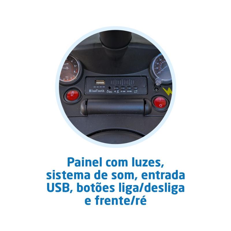 Volante com buzina e seletor de música, entrada USB e Bluetooth, indicador de bateria, e apoio de costas ergonômico para conforto e diversão garantidos.Praticidade e Conveniência: