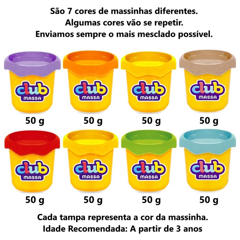 São 7 cores de massinhas diferentes. Algumas cores vão se repetir. Enviamos sempre de forma mais mesclada possível.