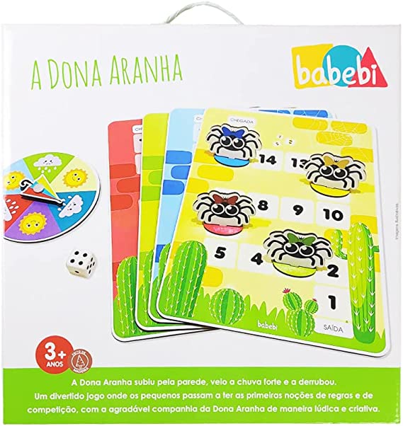 Contém 4 tabuleiros que medem 26 x 19 cm e 4 peões A Dona Aranha. 1 roleta e 1 dado.