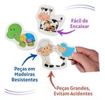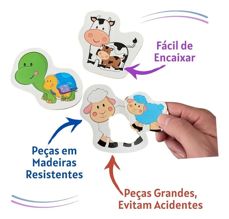 Jogo educativo para a criança encaixar os filhotes nas figuras de seus pais. Desenvolve a coordenação motora, o raciocínio e a percepção visual de forma divertida. Contém 12 peças grandes em madeira reciclada, coloridas e resistentes.