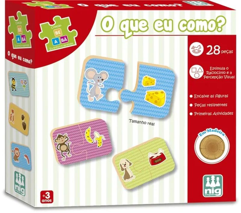 Nesse jogo a criança vai observar cada animal e encaixar a peça que corresponde à sua comidinha. Os pares são da mesma cor para auxiliar na tarefa. Contém 28 peças grandes de madeira reciclada, coloridas e resistentes.