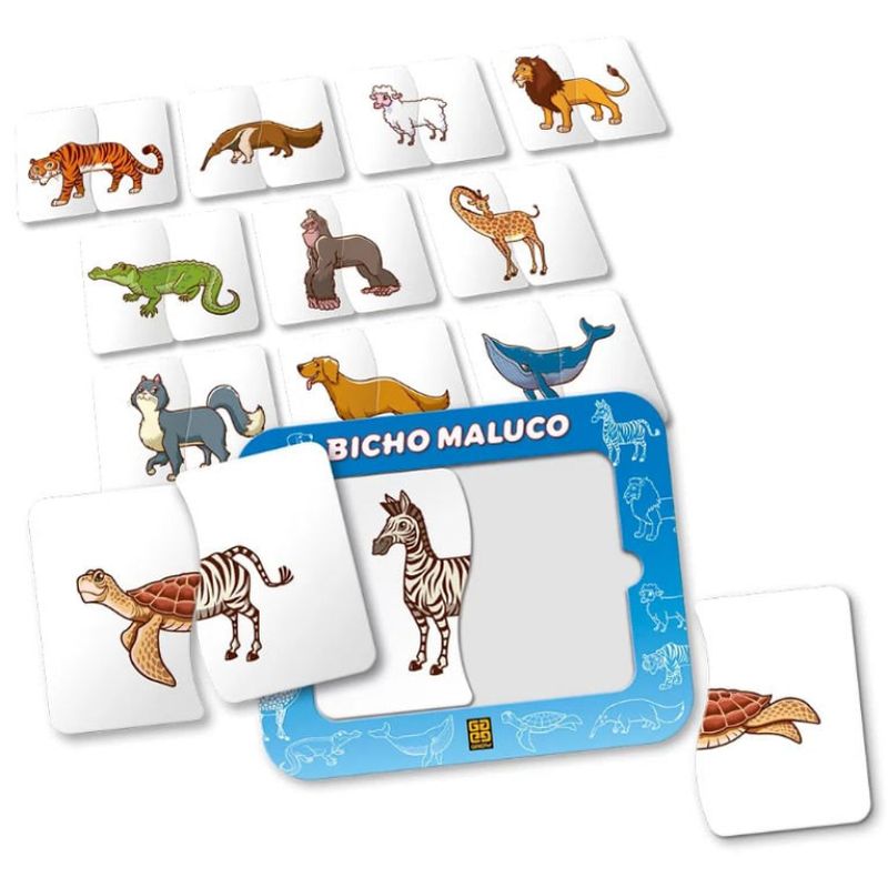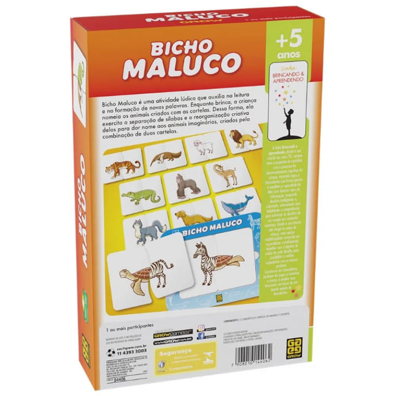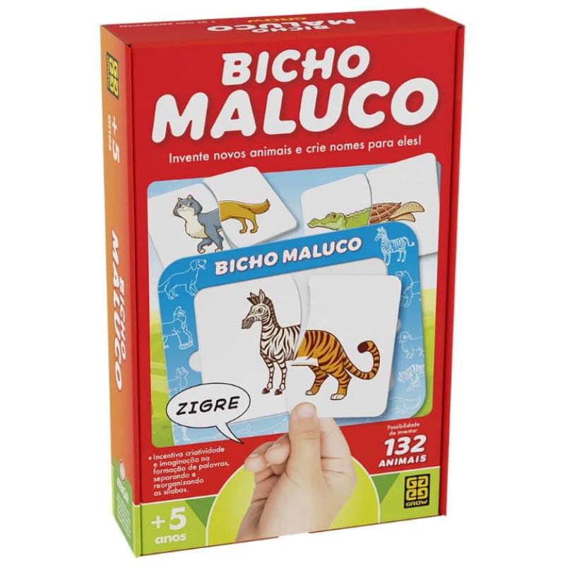 Bicho Maluco da Grow é muito mais do que um jogo, é uma emocionante jornada de aprendizado! Enquanto se diverte, a criança embarca em uma aventura que estimula a leitura e a formação de novas palavras. Com a tarefa de nomear os animais criados pelas cartelas, ela desenvolve habilidades fundamentais, como a separação de sílabas e a criatividade necessária para dar vida aos animais imaginários gerados pela combinação de duas cartelas. Uma maneira empolgante e educativa de aprender brincando!