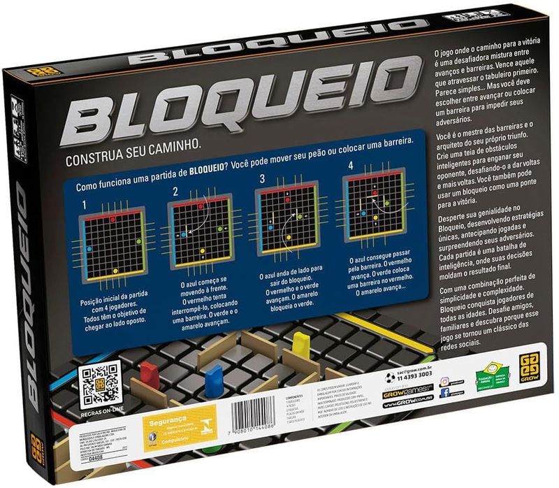 O jogo onde o caminho para a vitória é uma desafiadora mistura entre avanço e barreiras. Vence aquele que atravessar o tabuleiro primeiro. Parece simples... Mas você deve escolher entre avançar ou colocar uma barreira para impedir seus adversários.