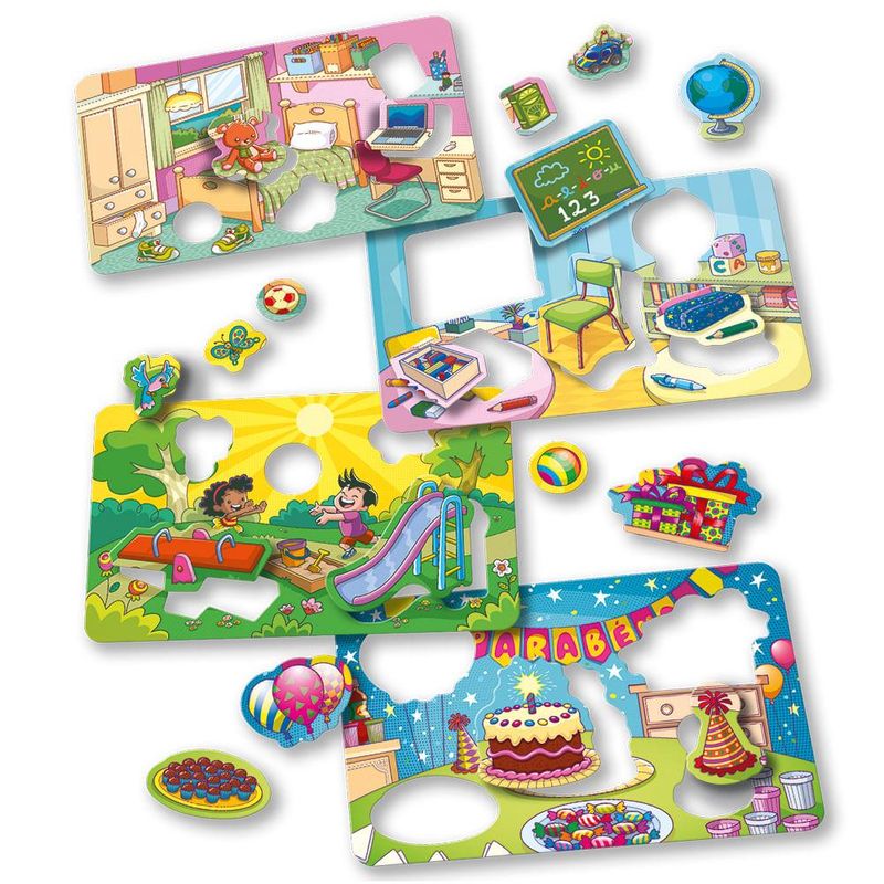 São vinte peças que, com a ação da criança, são devolvidas ao seu devido lugar.
