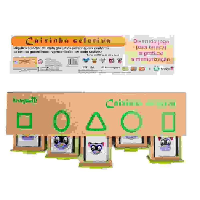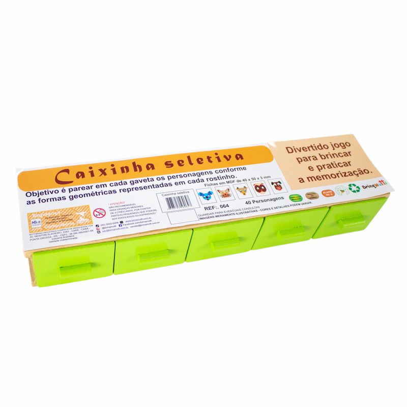 O Brinquedo Educativo Caixinha Seletiva é composto por 1 caixinha de madeira com 05 gavetas e 40 peças geométricas.