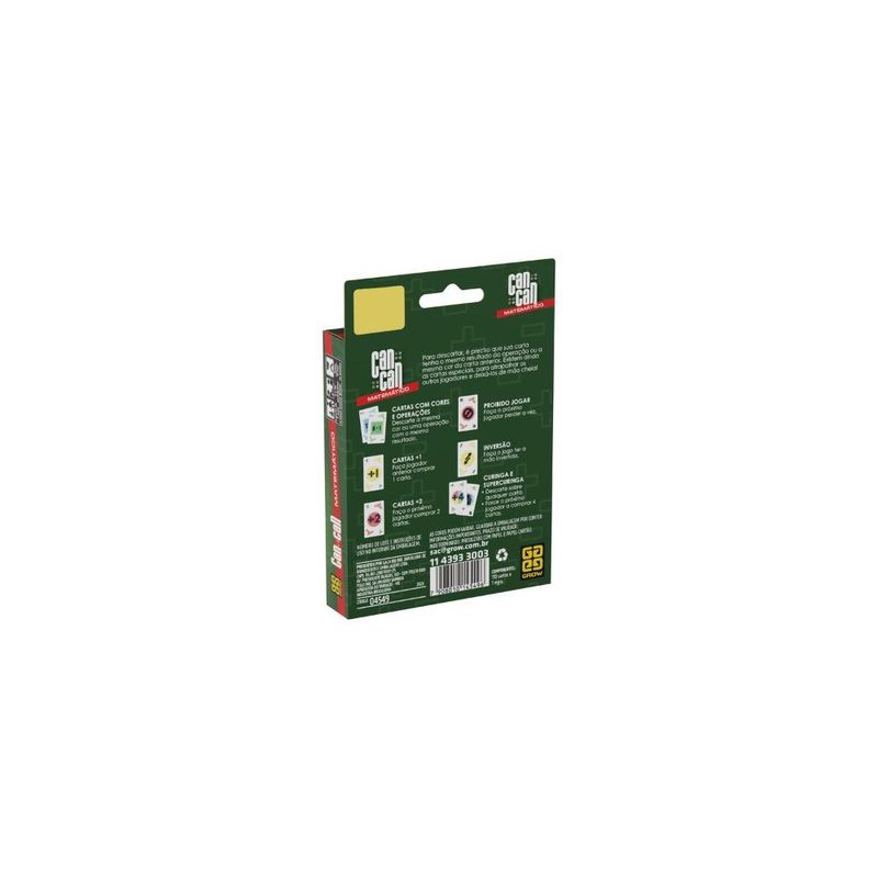 Ficha Técnica:Nome do produto: Jogo Can Can Matemático;Marca: Grow;Idade recomendada: A partir de 7 anos;Selo Inmetro: CE-BRI/ICEPEX-N 01264-25;Contém: 110 cartas e 1 folheto de regra.