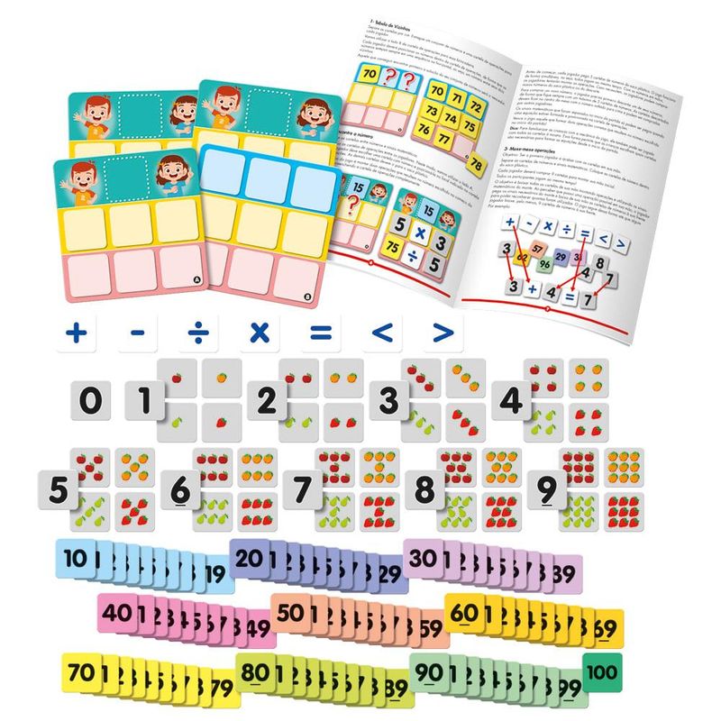 Contém: 4 cartelas de operações, 165 cartelas de números/sinais, 1 saco plástico e 1 regra