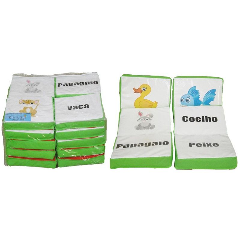 Jogo da memória gigante para relacionar figura com palavra, confeccionado em espuma, revestido de couro. Impresso em bagum com tinta solvente.