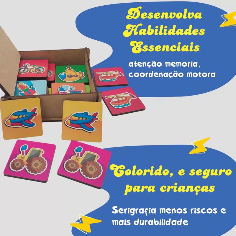 Acondicionado em uma linda caixa de madeira com tampa, esse jogo da memória vai proporcionar muita diversão e aprendizado para as crianças!