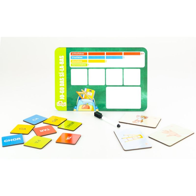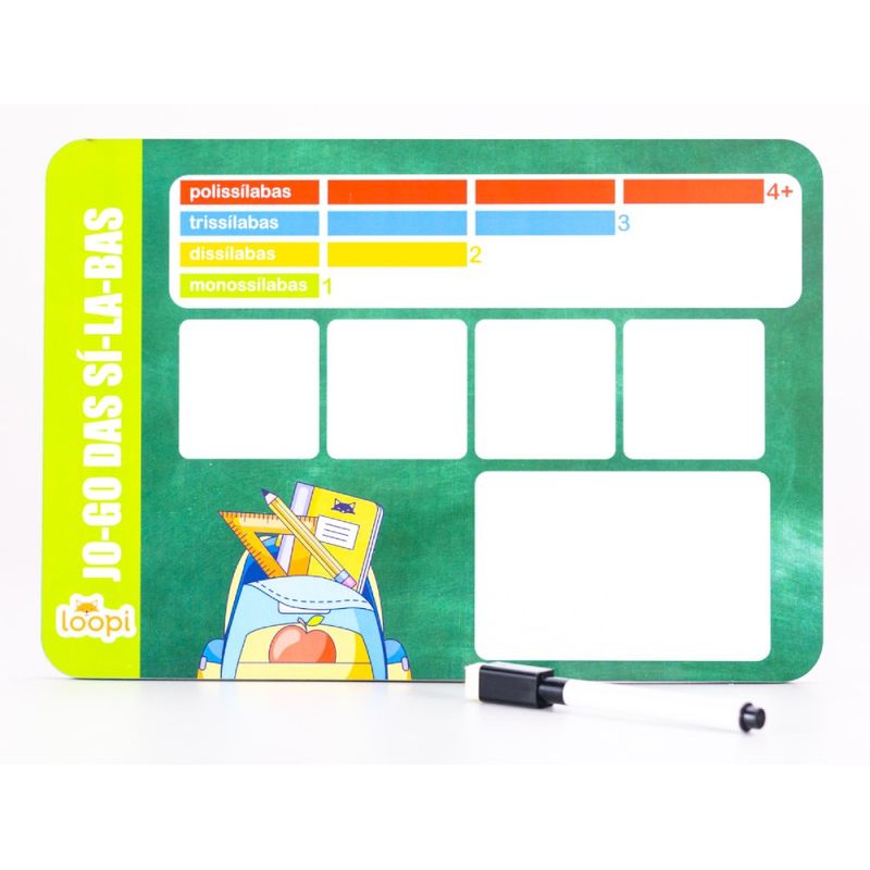 Contém 1 tabuleiro, 1 canetinha com apagador e 42 peças para formar palavras com a separação e classificação silábica.